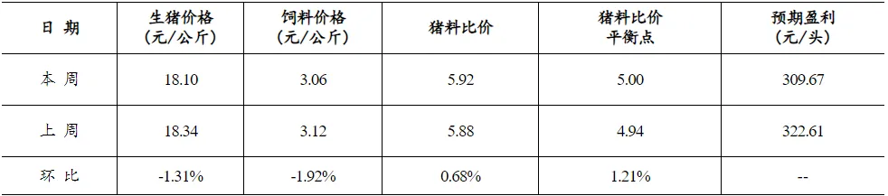 本周全国猪料比价为5.92,环比上涨0.68%。按目前价格及成本推算,未来仔猪育肥模式的生猪养殖头均盈利为309.67元。