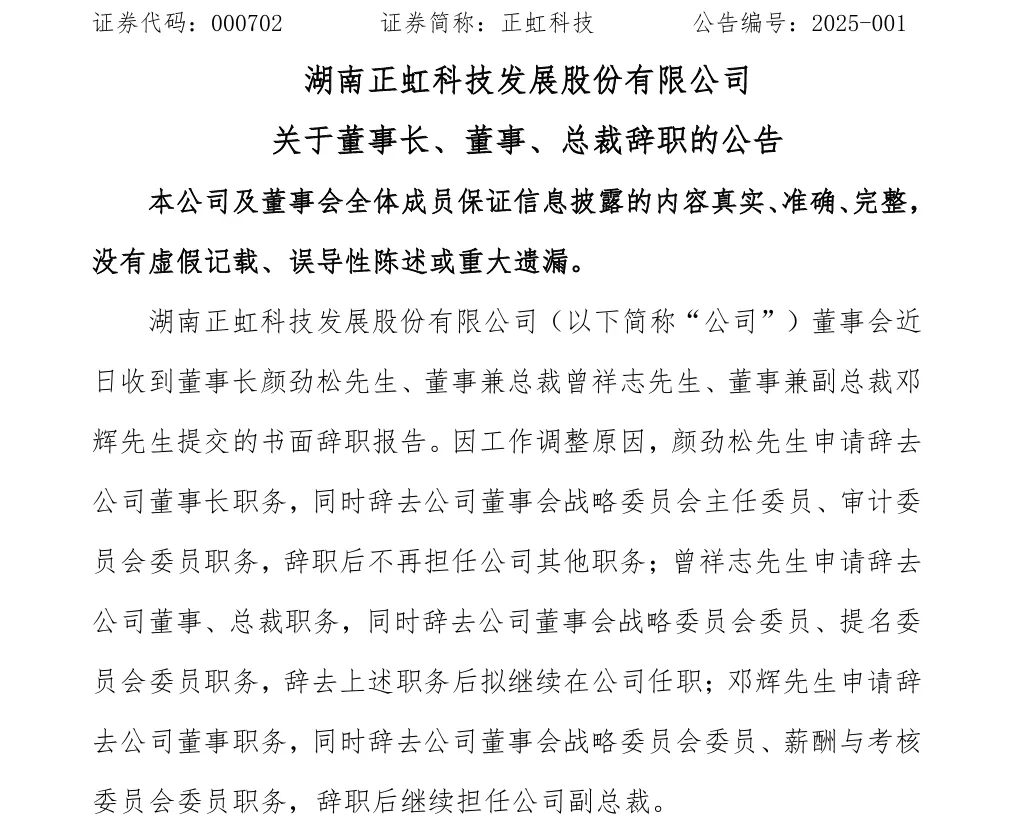 1月3日晚间,正虹科技(000702)公告,董事会近日收到3名高层人员提交的书面辞职报告。
