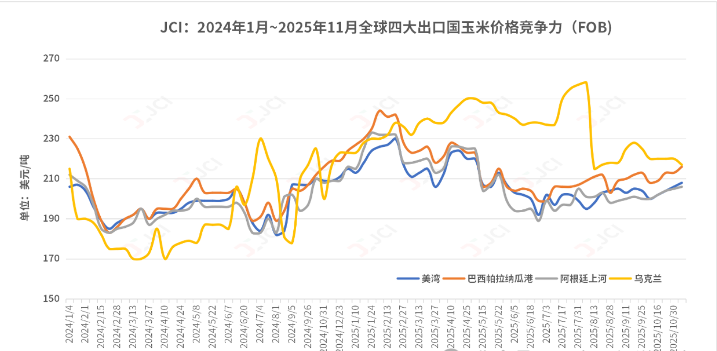 截至11月6日,美国墨西哥湾FOB玉米价格全球最低,阿根廷仍略具对亚洲出口的优势。但在征收额外关税的情况下,美国谷物对华出口仍无明显优势。