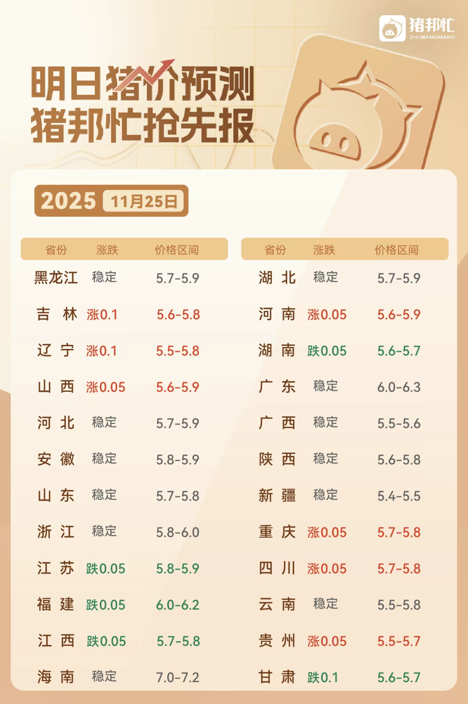 截至2025年11月24日,全国外三元生猪均价为12.13元/公斤(约6.07元/斤),较昨日微跌0.05元/公斤,跌幅0.41%。当前猪价呈现“北方涨跌互现,南方涨势收窄”的特点,全国31个监测省份中10个上涨、12个持平、9个下跌。