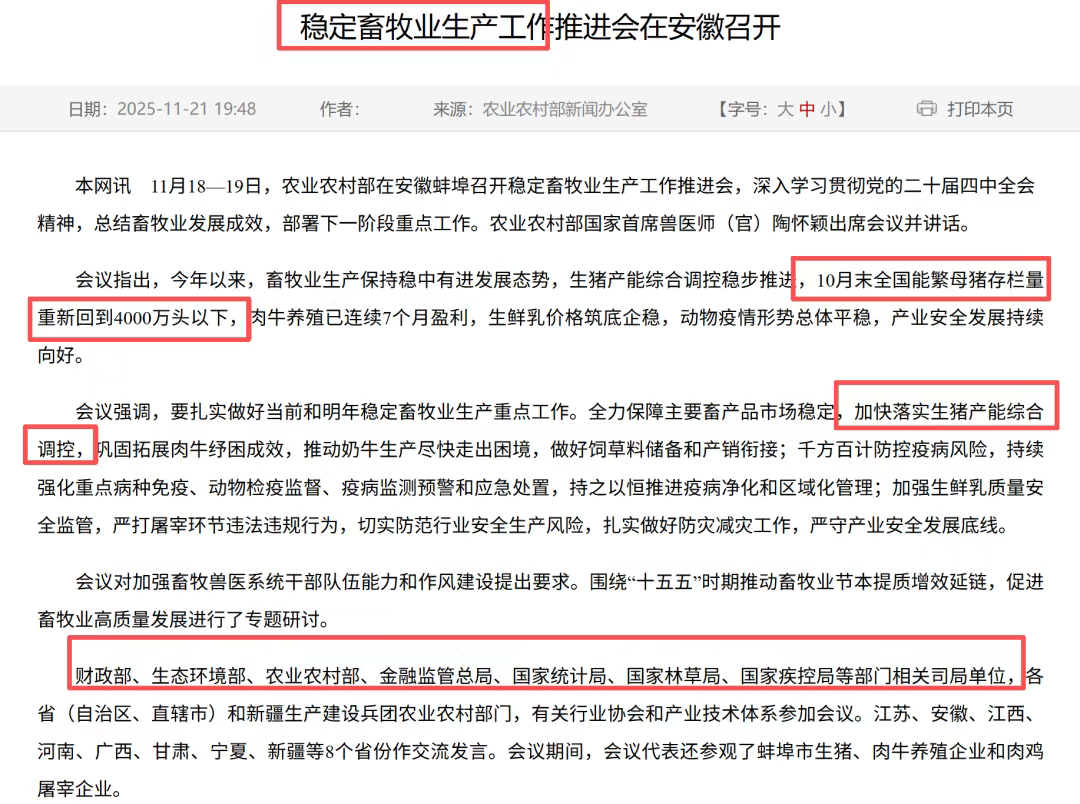1)调控主体更综合: 考虑的主体更为广泛,不同规模养殖主体都纳入统一的调控视野。同时,会议列席部门包括财政部、生态环境部、金融监管总局等,意味着未来调控将是财政、环保、金融、土地等多部门、多政策的“组合拳”。