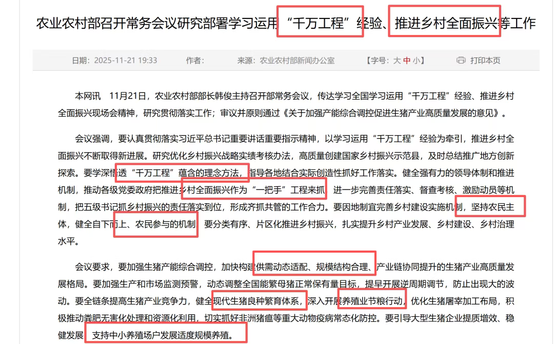 11月21日农业农村部召开常务会议研究部署学习运用“千万工程”经验、推进乡村全面振兴等工作会议。