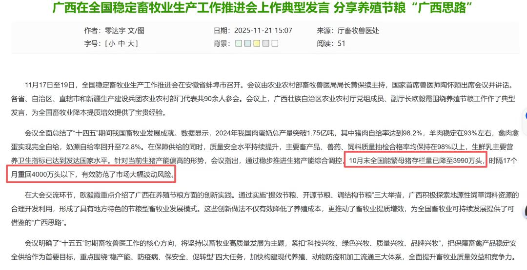 1)对大型猪企: “跑马圈地”时代宣告结束。 会议明确“引导大型生猪企业提质增效、稳健发展”,并调研了头部猪企安徽猪场的节本增效实践。信号很清晰:大企业的发展重点必须从外部扩张转向内部挖潜,通过优化母猪群、降低出栏体重、应用智能化管理来实现“精细化管理”。