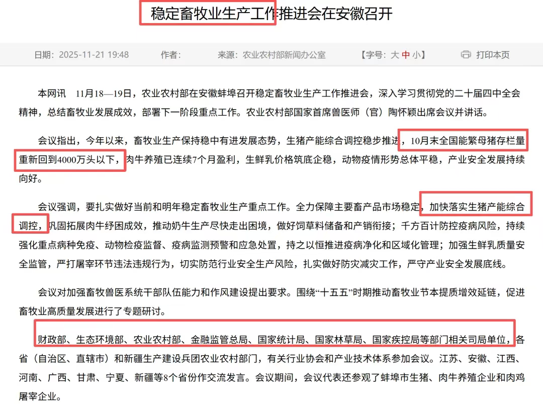 2025年11月18—19日,农业农村部在安徽蚌埠召开稳定畜牧业生产工作推进会,为当前生猪产业发展划下重点:会议不仅官宣10月末全国能繁母猪存栏量降至3990万头,时隔17个月重回4000万头以下,更明确下一阶段要“加快落实生猪产能综合调控、强化疫病防控、推进节本提质”三大核心任务。会议期间,农业农村部畜牧兽医局局长黄保续还率160人调研团赴安徽固镇牧原二场实地考察,检验企业产能调控实践;广西壮族自治区农业农村厅党组成员、副厅长欧毅霞则在会上分享养殖节粮经验,形成“政策定调 +企业落地+地方赋能”的生猪产业发展新路径。