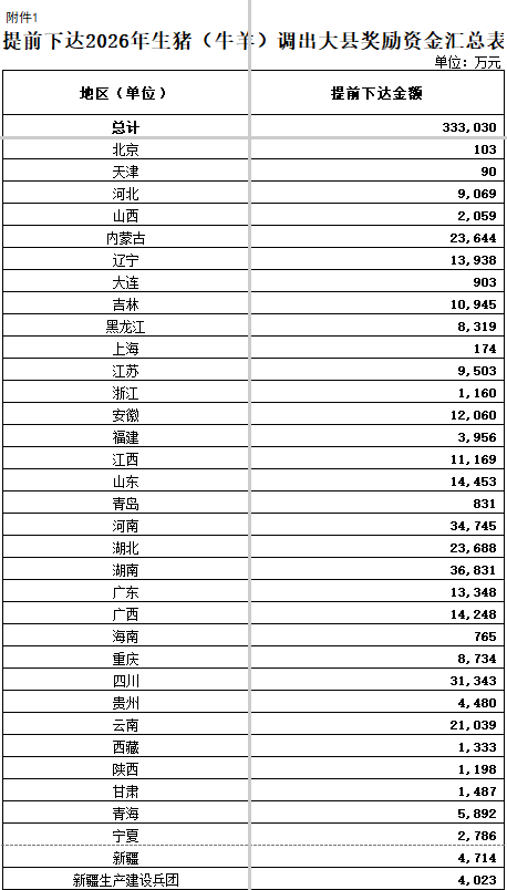 【2026年生猪(牛羊)调出大县巨额奖励预算】按照预算管理及有关规定,经研究,财政部提前下达(自治区、直辖市、计划单列市、新疆生产建设兵团,以下统称省)2026年生猪(牛羊)调出大县奖励资金预算(项目名称:生猪(牛羊)调出大县奖励资金。该项资金为2026年生猪(牛羊)调出大县奖励资金预算的预下达,最终获支持县市区名单和具体金额将于2026年根据有关因素按程序确定,多退少补。