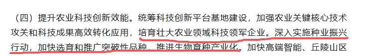 文件重点提及的“生物育种”、“培育科技领军企业”和“促进人工智能与农业结合”,直指产业升级的核心驱动力。