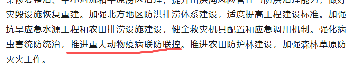 “推进重大动物疫病联防联控”这应该是一号文件对近几年非洲猪瘟等重大疫情教训的深刻总结。