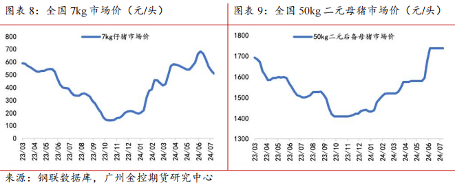 从仔猪价格来说,据钢联调研数据显示,截至7月19日,当周7kg仔猪平均价格为508.81元/头,较上周大幅下跌,补栏积极性快速下滑。
