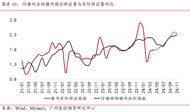 仔猪出栏量能够反映5-6个月后的商品猪出栏情况。我们利用仔猪的生产数据推算未来的猪肉供应量,并将其与实际猪肉供应量进行对比。根据过往的数据可以发现,在消费淡季,尤其是春节后,通常实际猪肉供应量要低于理论供应量,养殖端预估未来的市场行情更好,出现大规模的累库现象;而在二季度,尽管部分时候理论供应量出现明显下滑,但前期累库的供应量持续释放,实际供应量不会出现回落,且实际供应量大于理论供应量;三季度及四季度是猪肉消费旺季,通常理论供应量与实际供应量同步上涨,但存在阶段性猪价低位时养殖端部分累库的情况,实际供应量与理论供应量的绝对值并不完全一致。