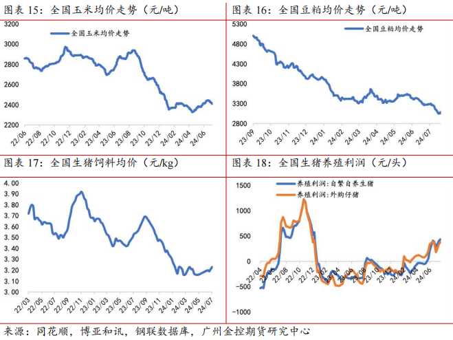 成本利润方面,2023年四季度以来,玉米及豆粕的价格回落明显,生猪饲料价格跟随原料价格的下跌出现大幅下滑。在原料价格下跌的背景下,行业养殖成本或将出现整体的下降。