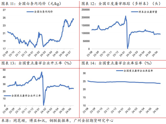 从屠宰端来说,据钢联数据统计,7月19日当周屠宰开工率23.64%,较上一周微跌0.27个百分点。当前终端消费疲弱,厂家开工继续缩量开工,目前多地气温偏高,白条消费处于淡季,终端批发市场交易疲弱,经销商采购不积极。近期白条受毛猪价格支撑处于阶段性高位,对消费也带来抑制,屠企承受亏损,继续缩量开工,部分外销量下降,多维持当地固定销售为主。目前下游需求短期难以好转,厂家缩量开工为主,但已经处于低位,再降空间有限。