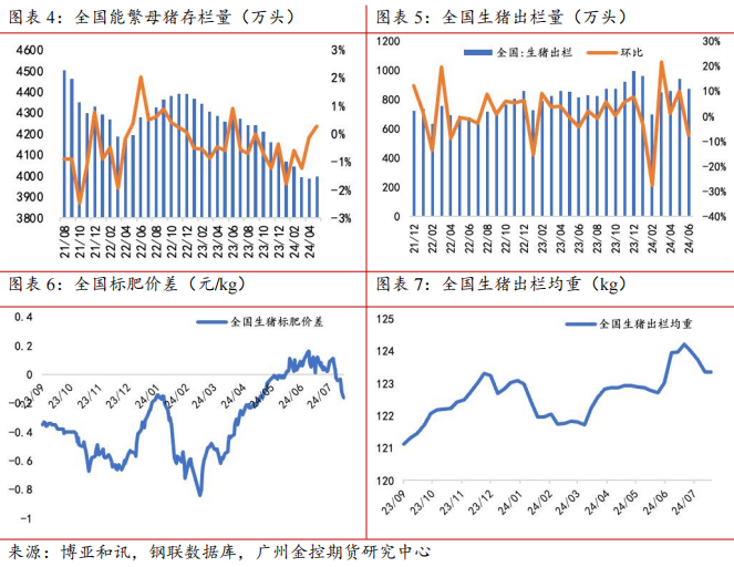 第三,从标肥价差来看,据钢联数据统计,截至7月19日,当周全国生猪标肥价差为-0.11元/kg,较上一周下滑明显。当周由于养殖端挺价压栏情况增多,且二次育肥截流部分标猪,肥猪出栏减少、价格上涨,同时北方进入高温天气,调运减少,标肥价差有所扩大,后续随着大猪猪不出栏,标肥价差将有所缩窄。