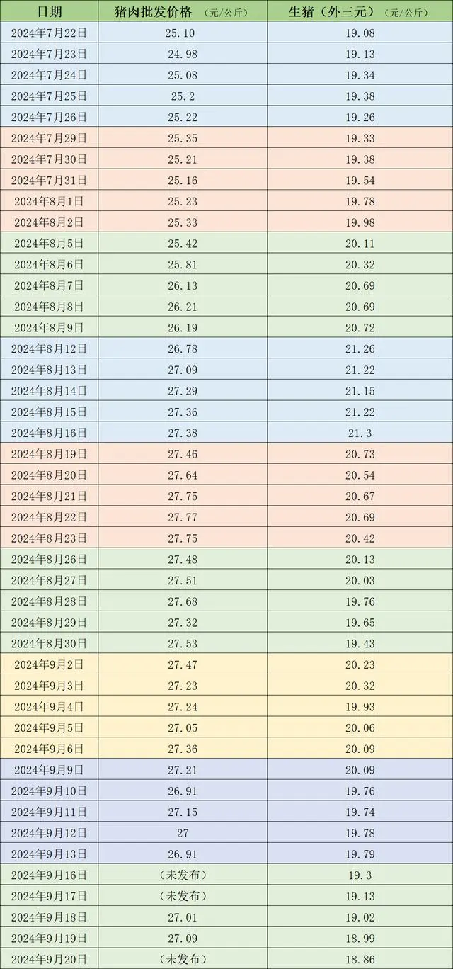 据农业农村部监测,9月19日,全国农产品批发市场猪肉平均价格为27.09元/公斤,与上周五(9月13日)的26.91元/公斤相比,上涨0.7%。本周的平均价格为27.05元/公斤,与上周27.04元/公斤的均价相比,基本持平。