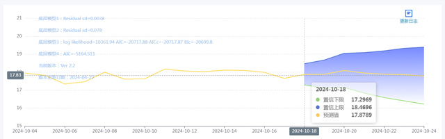 今日部分省份/直辖市/自治区外三元、内三元、土杂猪均价: 1、外三元方面:江西省18.16元/公斤、新疆维吾尔自治区16.83元/公斤、河南省17.48元/公斤、天津市18.21元/公斤、海南省17.77元/公斤、吉林省17.60元/公斤、四川省17.85元/公斤; 2、内三元方面:上海市20.00元/公斤、青海省17.70元/公斤、湖北省17.86元/公斤、山西省17.51元/公斤、广东省18.50元/公斤、辽宁省17.89元/公斤、重庆市17.60元/公斤; 3、土杂猪方面:安徽省18.30元/公斤、青海省18.48元/公斤、湖北省17.87元/公斤、河北省17.47元/公斤、海南省18.58元/公斤、辽宁省17.75元/公斤、西藏自治区9.93元/公斤; 玄田算法是由项目课题组团队原创的非经典逻辑数值聚合理论和不确定性预测方法,构建了基于一致模算子的生猪价格预测模型。该模型采用的聚合函数及一致模相关理论与方法已获得多项国家自然科学基金和省级自然科学资金资助,并获得多项省级自然科学奖奖项。10月18日预测猪价为17.8789,置信区间在17.2969--18.4696之间。10月19日预测猪价为17.8871;10月20日预测猪价为18.0940。