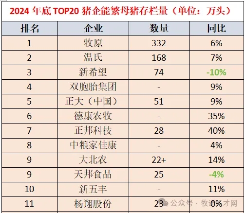 据新猪派最新统计显示,截至2024年末,能繁母猪TOP20有25家猪企(门槛10万头以上),合计拥有母猪1060万头!