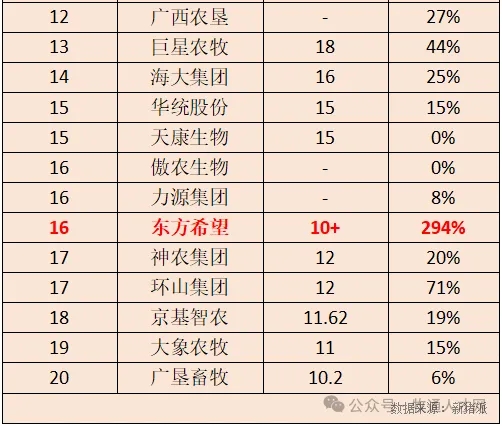 值得关注的是,今年新“加入群聊”的东方希望,母猪存栏量同比暴增294%。去年公司母猪存栏量不足5万头,今年年末母猪10万头以上!