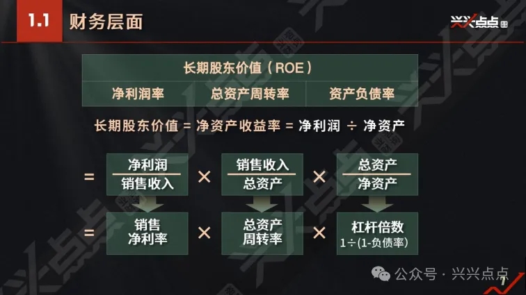 陈兴表示,公司要实现怎样的经营结果,需要重点关注的是净利润率、总资产周转率以及资产负债率等三个财务指标。从企业经营角度,最终是要获得长期股东价值的。而影响长期股东价值的关键要素,就是这三个财务指标。