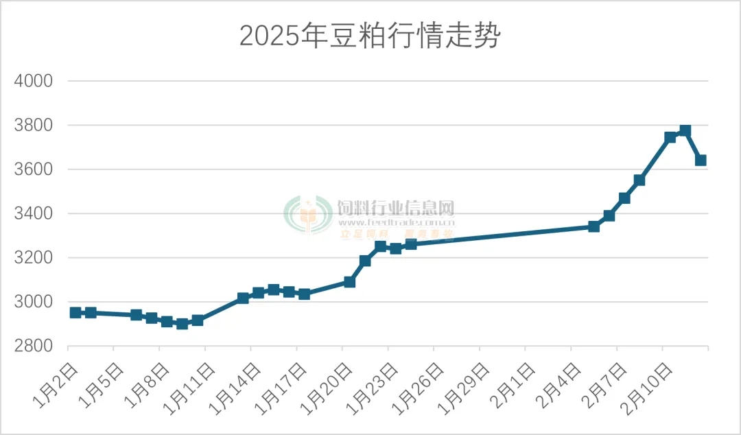 春节后的豆粕市场可谓一天一涨价,终于在2月11日有所降温。截止到2月12日豆粕现货均价涨至3775元,较年前上涨400元左右,较1月初上涨超800元,更有部分贸易商报价格涨至4000元,涨幅近1000元。