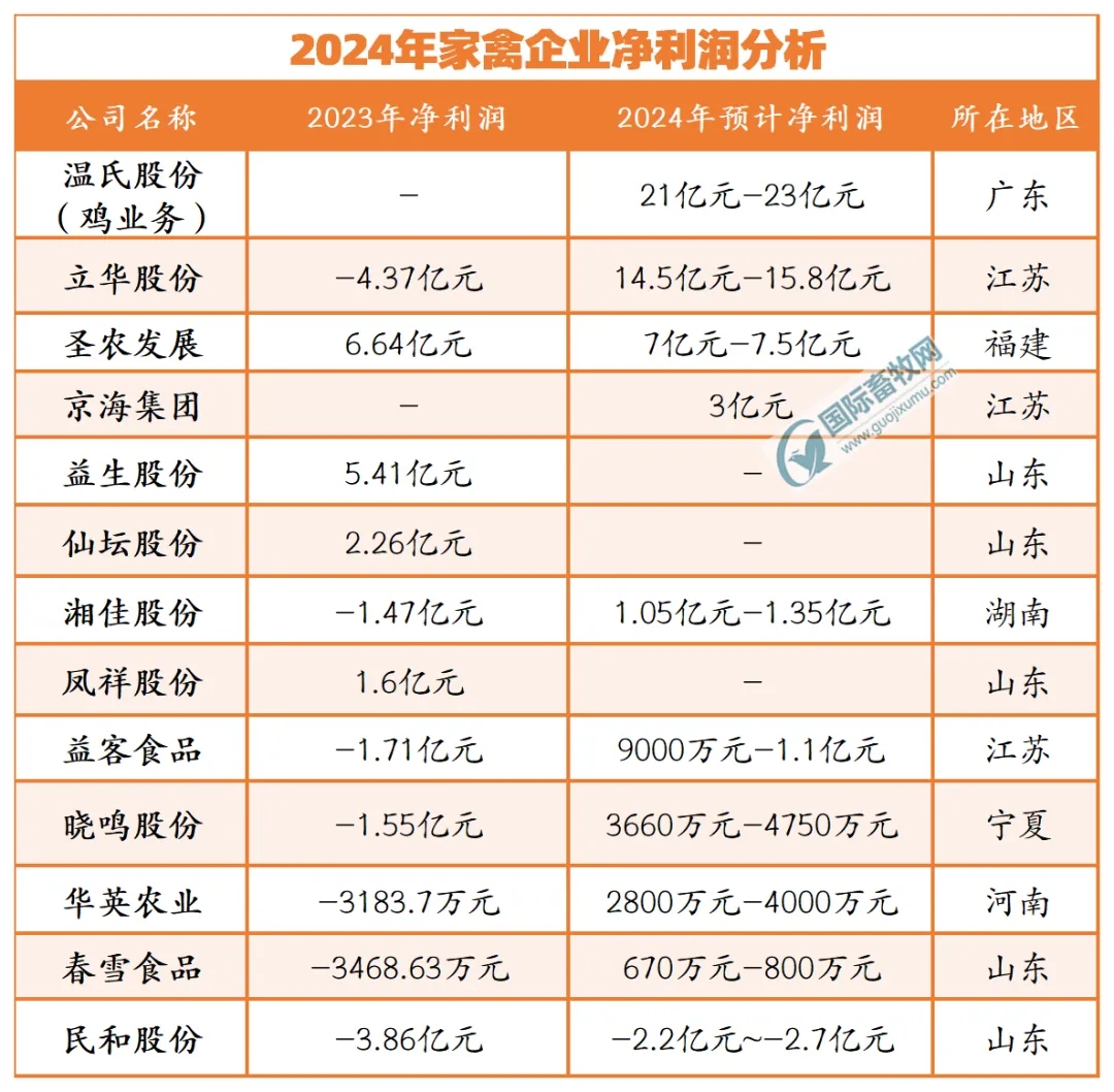 近日,福建圣农、广东温氏、德康集团、江苏京海、江苏立华、山东民和、江苏益客、湖南湘佳、晓鸣股份等13家家禽企业公布业绩情况,今年业绩相较于2023年有较大改善,2024年仅1家企业亏损,其余全部盈利。