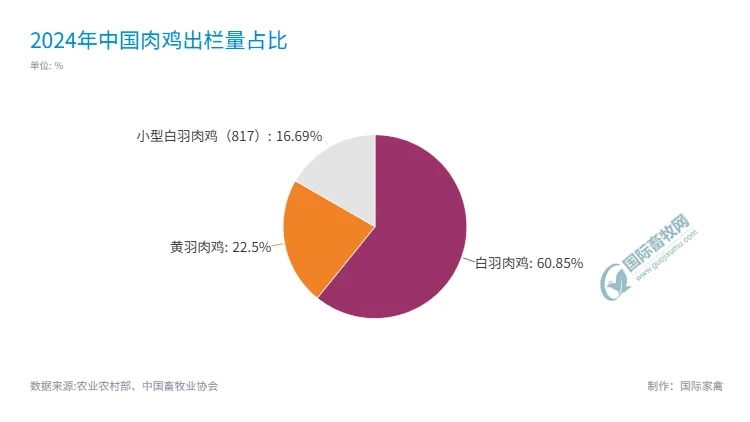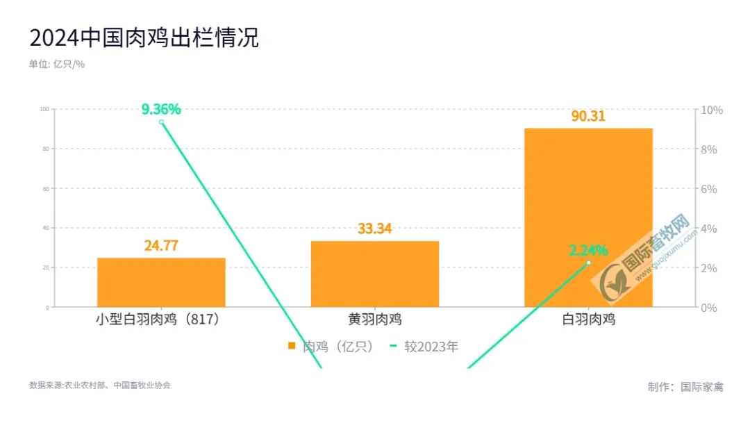 2024年受消费市场疲软影响,肉鸡生产规模扩张受到阻碍,全年鸡肉总产量小幅上涨。2024年肉鸡(包括白羽、黄羽和小型白羽肉鸡)总出栏数量148.42亿只。其中白羽肉鸡突破90亿只 、黄羽肉鸡下降明显、817增长加快。