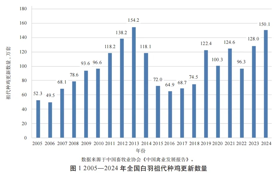 根据中国畜牧业协会监测数据,2024年我国白羽肉鸡祖代年度更新150.07万套,较2023年增加17.25%,接近2013年154.16万套的历史最高位水平。