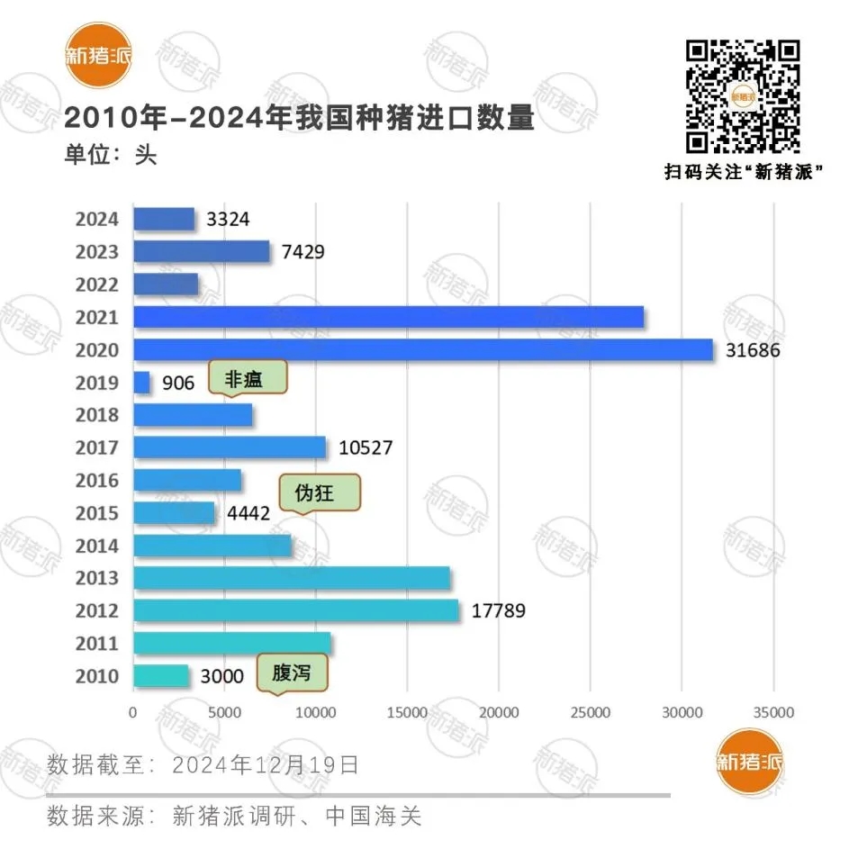 据新猪派统计,在国内大型企业日益健全的种猪繁育体系与国家政策的强有力支撑下,2024年中国进口种猪仅3324头,为近五年新低。这不仅体现了我国在种猪育种领域的自主创新能力,也为未来种猪遗传能力的不断提升奠定坚实的基础。