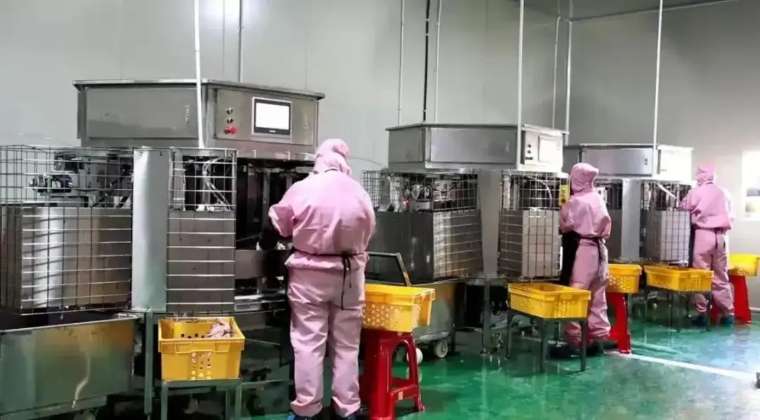 据介绍,脱骨鸡爪厂由更衣消毒区、解冻区、剔骨区、包装区等构成。生产中,车间里保持18摄氏度恒温状态,全程由电脑控制,不仅保障了脱骨后的鸡爪干净卫生,更大大提升了脱骨效率,每人每天产量是人工剔骨产量的2.5倍。
