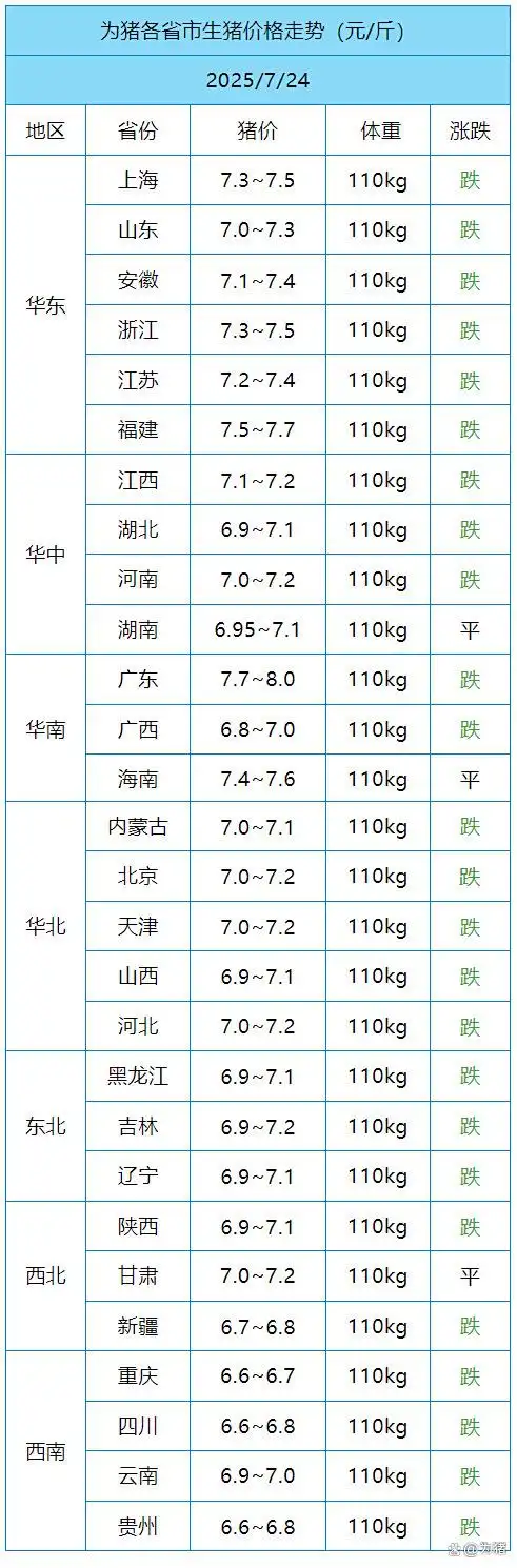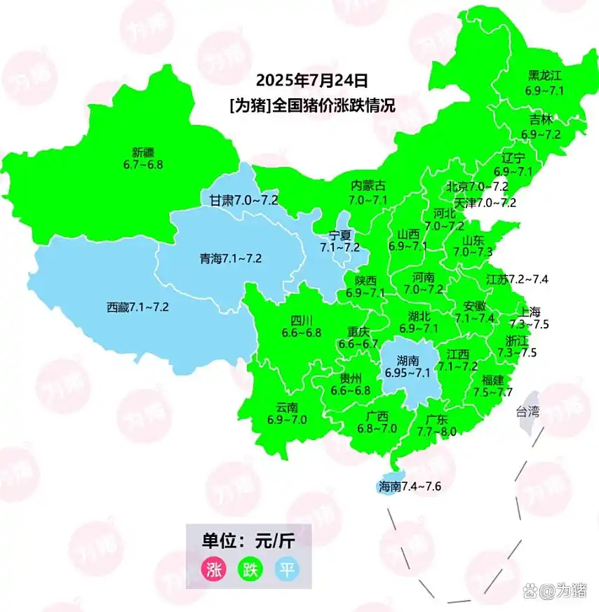 今日全国生猪收购均价呈现下跌态势,标准体重生猪平均价格为7.19元/斤,环比昨日下跌0.01元/斤,上涨地区1个,下跌地区14个,稳定地区13个,全国生猪收购最低价为新疆,价格为6.7元/斤,最高价为广东,价格为8.1元/斤。