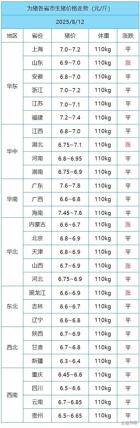 今日全国生猪收购均价呈现稳定态势,标准体重生猪平均价格为6.89元/斤,环比昨日基本持平,上涨地区3个,下跌地区11个,稳定地区14个,全国生猪收购最低价为新疆,价格为6.3元/斤,最高价为广东,价格为7.8元/斤。