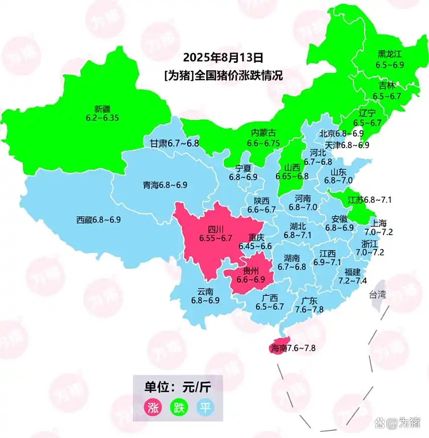 今日全国生猪收购均价呈现下跌态势,标准体重生猪平均价格为6.88元/斤,环比昨日下跌0.01元/斤,上涨地区3个,下跌地区7个,稳定地区18个,全国生猪收购最低价为新疆,价格为6.3元/斤,最高价为广东,价格为7.8元/斤。