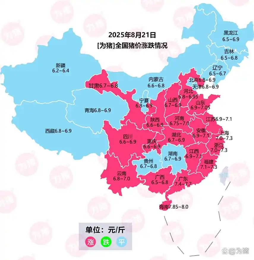 今日全国生猪收购均价呈现上涨态势,标准体重生猪平均价格为6.92元/斤,环比昨日上涨0.04元/斤,上涨地区19个,下跌地区0个,稳定地区9个,全国生猪收购最低价为新疆,价格为6.2元/斤,最高价为海南,价格为8.0元/斤。