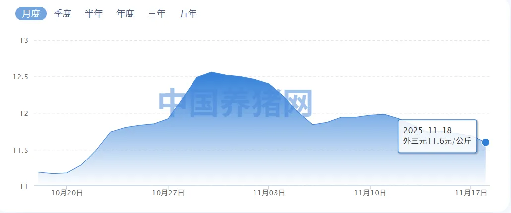 国内将迎来新一轮寒潮,全国各地气温骤降,本应是猪肉消费旺季的序幕拉开,然而市场却并未迎来预想的消费旺季。据国家发改委网站消息,截至11月12日当周,全国猪料比价为4.78,环比下跌1.65%。按目前价格及成本推算,未来仔猪育肥模式的生猪养殖头均盈利为-199.68元。这一数据不仅折射出当前猪肉价格的疲软态势,更反映出市场对传统需求旺季提振信心的逐步消退。