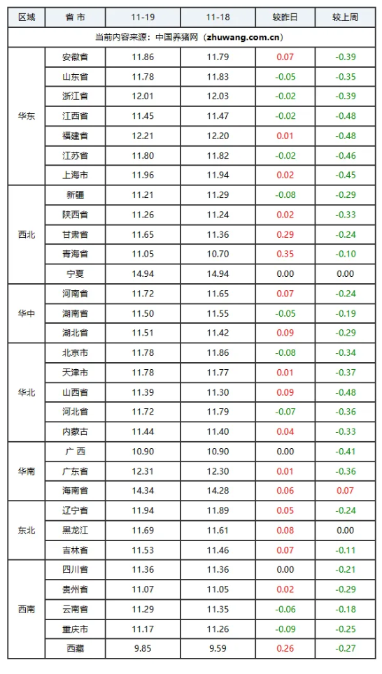 根据中国养猪网数据,11月19日全国各地区价格出现小幅上扬,呈现整体反弹态势。此次猪价“一夜反弹”主要是受季节性因素影响,尤其近日寒潮来袭导致南北气温明显下降,天气转冷提振鲜肉消费需求,终端市场居民采购积极性预计提升。同时,养殖端对后期猪价预期有所改善,市场压栏增重、惜售待涨情绪逐步增强。后期随着西南地区气温降低,或促使居民提前启动腌腊活动,从而带动鲜品猪肉需求回暖。然而,当前生猪供应压力仍然突出。集团猪企月度出栏进度偏慢,后期存在集中出栏预期,加之出栏体重上升,市场猪肉供给充裕,猪价持续上涨动力有限。建议养殖户理性看待反弹,切勿盲目压栏。