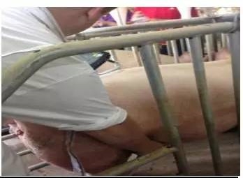 4、目测孕检靠观察每头母猪,是在妊娠28-35天时已确认怀孕,且未发现发情迹象,一般于配种后50天至70天进行,每周指定安排一个时间来进行目测检察。在妊娠50天较难观察到,因为该天数母猪侧腹和腹部肿胀现象很小,所以通常在70天-100天观察较为明显。后备猪目测孕检可提早,因为经产母猪腹部由于以往生产经历可能会有所膨大。目测的征兆包括下肋部逐渐肿胀,随着孕期进展腹部会逐渐肿起、下垂;主要观察侧腹的肿胀和腹部胀大并逐淅下垂,乳头更坚挺,随着分娩时间的临近,阴户肿胀、下垂、松驰,母猪因不堪重负而行走蹒跚。