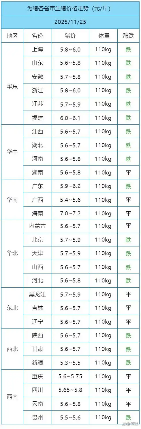 市场表现较差,猪价下调为主,今日东北华北地区散户认卖度低,主流报价在5块7到5块9,今日河南一哥出栏价格下调3毛,广东大场下调2毛,南北表现都弱,目前已经到11月月底,大场缩量想拉涨,但没起到作用,西南地区腌腊有增加,目前对四川猪价有支撑,但力度也一般。大场出栏开始有增加情况,短期猪价难涨,还需要等待机会。关注我带你了解最新的猪价行情。