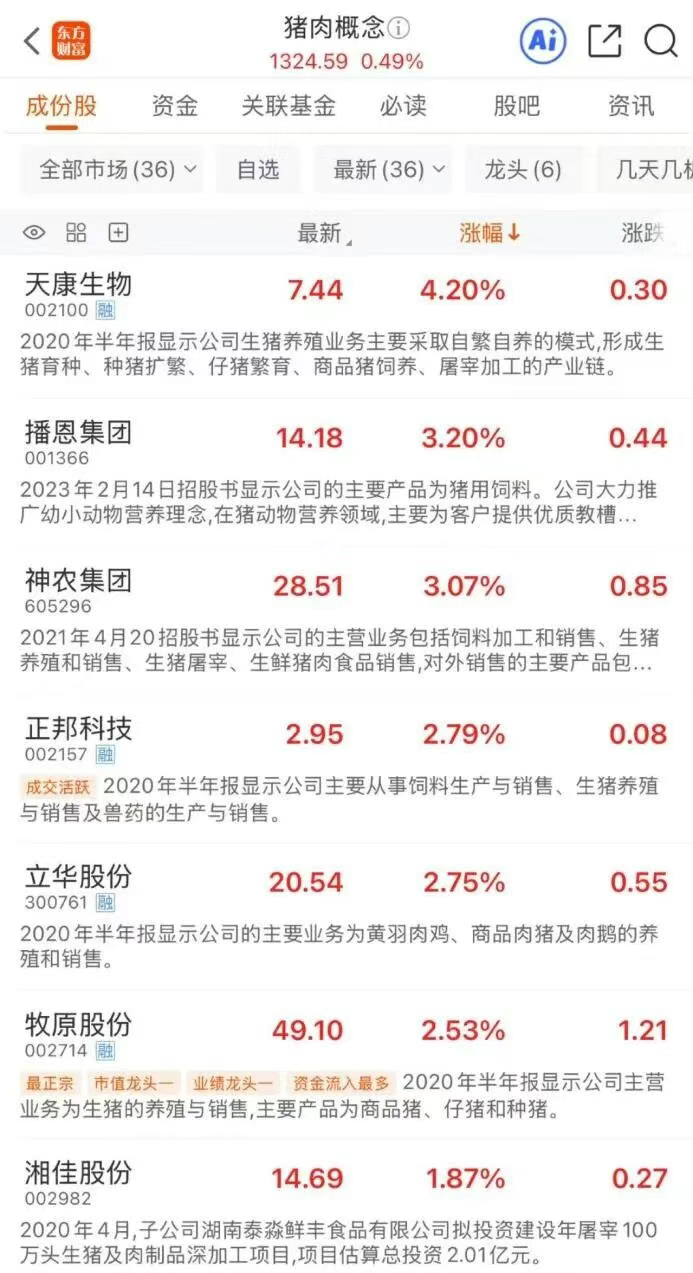 11月24日(周一),猪肉概念多股异动。截至早间收盘,天康生物涨超4%,播恩集团、神农集团涨超3%,正邦科技、立华股份、牧原股份涨超2%,湘佳股份、正虹科技、巨星农牧、东瑞股份等多股涨超1%。