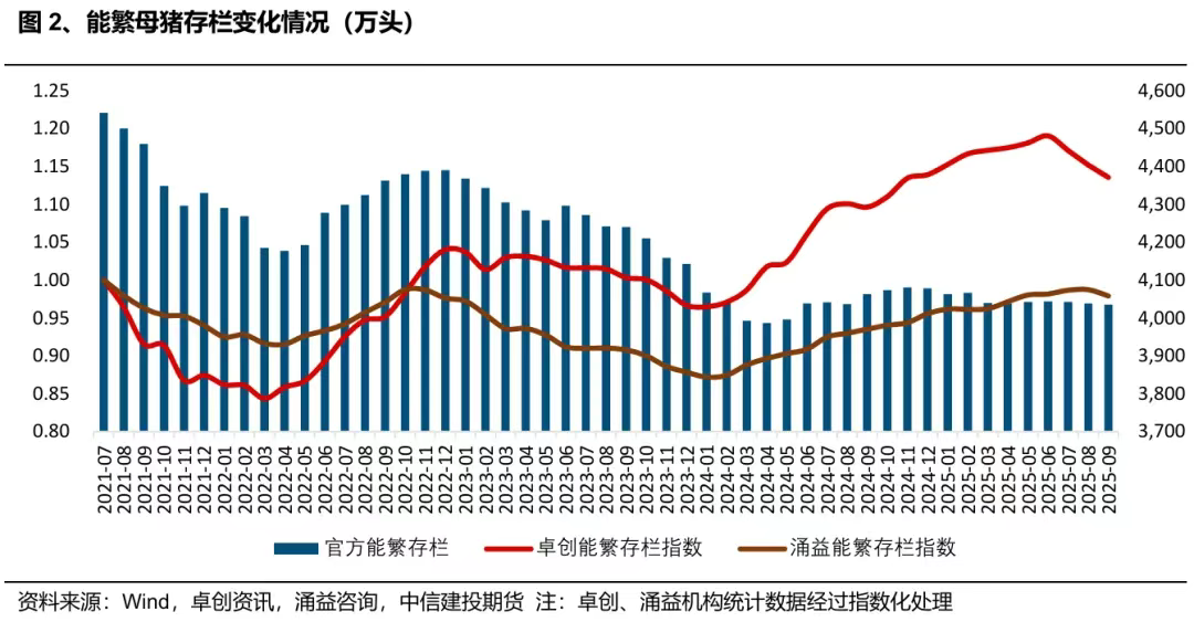 经过数月产能调控,生猪产能去化终见成效,全国能繁母猪降至4000万头以下。10月份能繁母猪存栏3990万头,环比-1.1%,行业去产能加速。历经17个月再度回落至4000万头以下,这一情况标志着生猪产能正式步入政策预设的 “绿色合理区间”(3900万头±8%)。