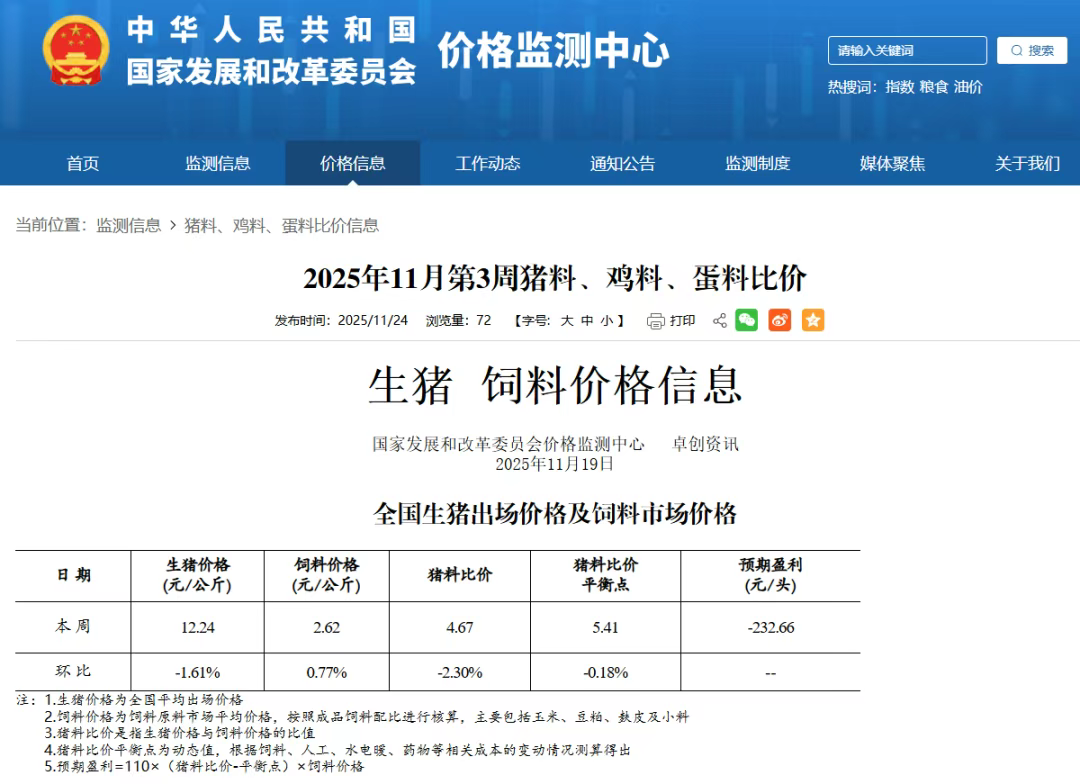 消息方面,11月21日(上周五),农业农村部召开部常务会议,审议并原则通过《关于加强产能综合调控促进生猪产业高质量发展的意见》。会议要求,要加强生猪产能综合调控,加快构建供需动态适配、规模结构合理、产业链协同提升的生猪产业高质量发展格局。要加强生产和市场监测预警,动态调整全国能繁母猪正常保有量目标,提早开展逆周期调节,防止出现大的波动。