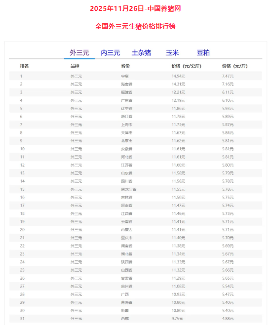 外三元排行前三:宁夏回族自治区14.94元/公斤、海南省14.31元/公斤、福建省12.21元/公斤;