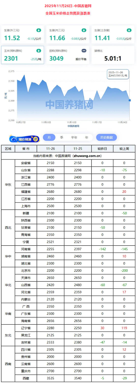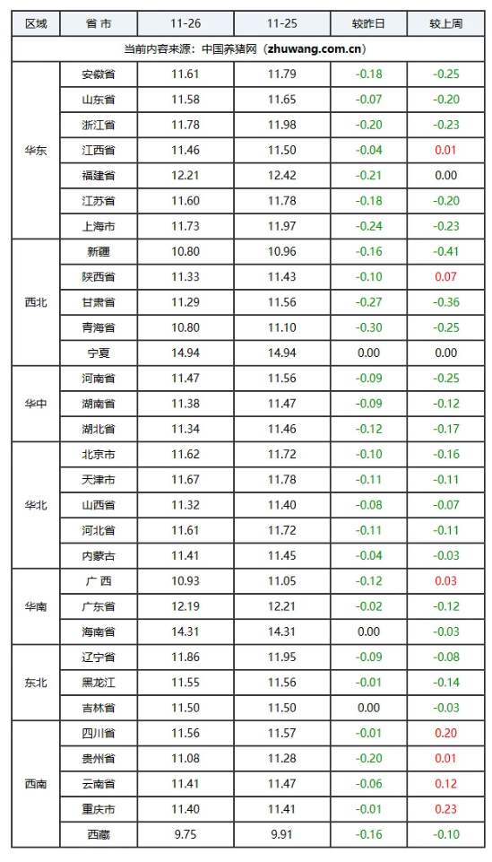 截至2025年11月26日,全国生猪价格整体延续弱势下行趋势,外三元生猪均价普遍在11.4-11.7元/公斤区间,较昨日继续小幅下跌,市场呈现“旺季不旺”的特征。此轮下跌主要受供需双向失衡影响。供应端,生猪出栏量集中且充足,部分养殖户存在恐慌性出栏,加剧了市场供应压力。需求端,尽管已进入传统腌腊季节,但南方腌腊需求启动缓慢,整体消费提振力度不足,对猪价支撑有限。短期来看,由于供应压力依然存在,而消费需求未现明显好转,猪价预计将继续承压,维持偏弱震荡走势。市场后续能否回暖,将主要取决于12月腌腊需求的集中释放程度以及养殖端的出栏节奏。