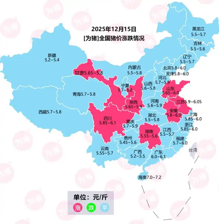 今日全国生猪收购均价呈现上涨态势,标准体重生猪平均价格为5.82元/斤,环比昨日上涨0.01元/斤,上涨地区7个,下跌地区0个,稳定地区21个,全国生猪收购最低价为新疆,价格为5.2元/斤,最高价为海南,价格为7.2元/斤。