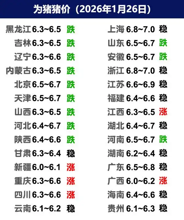 今目散户稳中调整,涨跌都有,集团猪价稳中偏弱调整。东北地区猪价涨跌调整,高价区微降,低价区涨。标猪主流价6.5元,外调中大猪微降。今日河南一哥缩量下调1-2毛,价格在6.6到7块之间,河南散户在6.56-6.78元。广东猪企今目稳定,挂牌价格在6块9,西南地区偏弱1行左右。这两日出现散户价格先于集团走弱的情况。上涨力度走弱,值得警惕。这波上涨乏力,下波估计要等春节前备货。关注我带你了解最新的猪价行情。