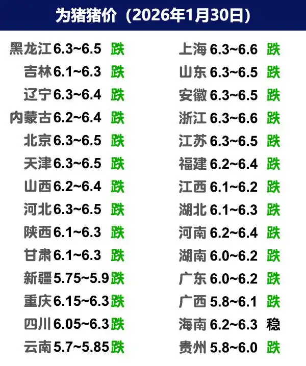 今日全国生猪收购均价呈现下跌态势,标准体重生猪平均价格为6.23元/斤,环比昨日下跌0.11元/斤,上涨地区0个,下跌地区27个,稳定地区1个,全国生猪收购最低价为新疆,价格为5.9元/斤,最高价为上海,价格为7.0元/斤。