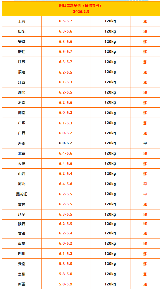 明日猪价 | 2026.2.3日~全国各地最新猪价(涨涨涨!猪价又是满堂红!)
