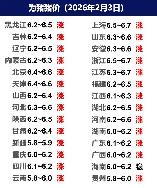 节前备货开始,今日南北猪价都表现上涨,东北地区上涨幅度在3到4毛,标猪主流价6.3-6.4元,散户标猪和中大猪普遍上涨,今日河南一哥出栏价格上涨3-4毛,成交价格在6块5,广东大场上涨2毛,挂牌价格在6块4,其它规模猪场涨2-4毛不等,表现都不错。南北反馈找猪都有增多。这一波节前上涨来了,有猪要卖的抓住机会出栏。
