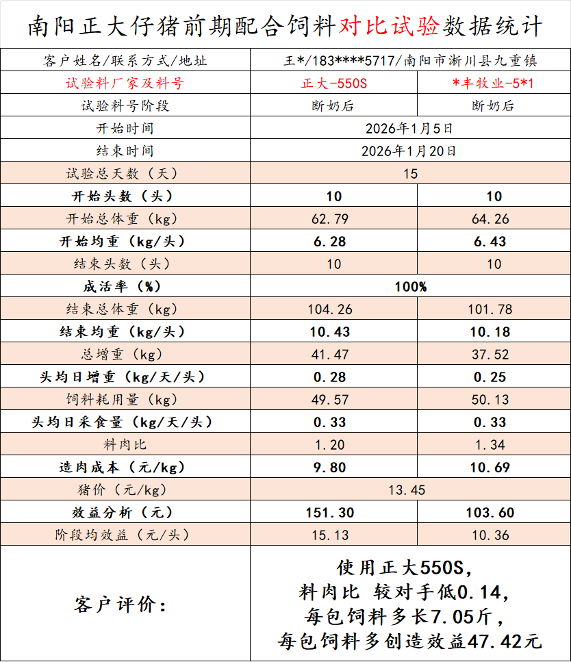 试验期间,使用正大550S,头均日增重较对手高0.03kg/天/头,料肉比较对手低0.14,每包饲料(40kg)较对手多长7.05斤,每包饲料多创造效益47.42元。