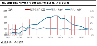 2025年猪肉及猪副产品进口量双降,这主要源于国产猪源充裕带来的看涨预期下降及进口关税调整带来的成本抬升。国产方面,从图5看到,2024年能繁母猪存栏持续量增加,2025年正值生猪产能释放期,供应过剩导致国产鲜品及冻品猪肉价格低位下降,进口产品价格优势削弱,部分产品甚至产生“倒挂”现象。下游客户对进口产品的青睐度下降,进口商普遍销售不畅而降价走量。进口方面,2025年中国主要进口国的猪肉总产量微增,出口能力提升。但3-4月对美国、加拿大增加对等关税及9-12月欧盟反倾销事件的确定,提升了进口商的进口成本。看涨预期下降叠加成本抬升,共同导致年内猪肉及猪副产品进口量减少。