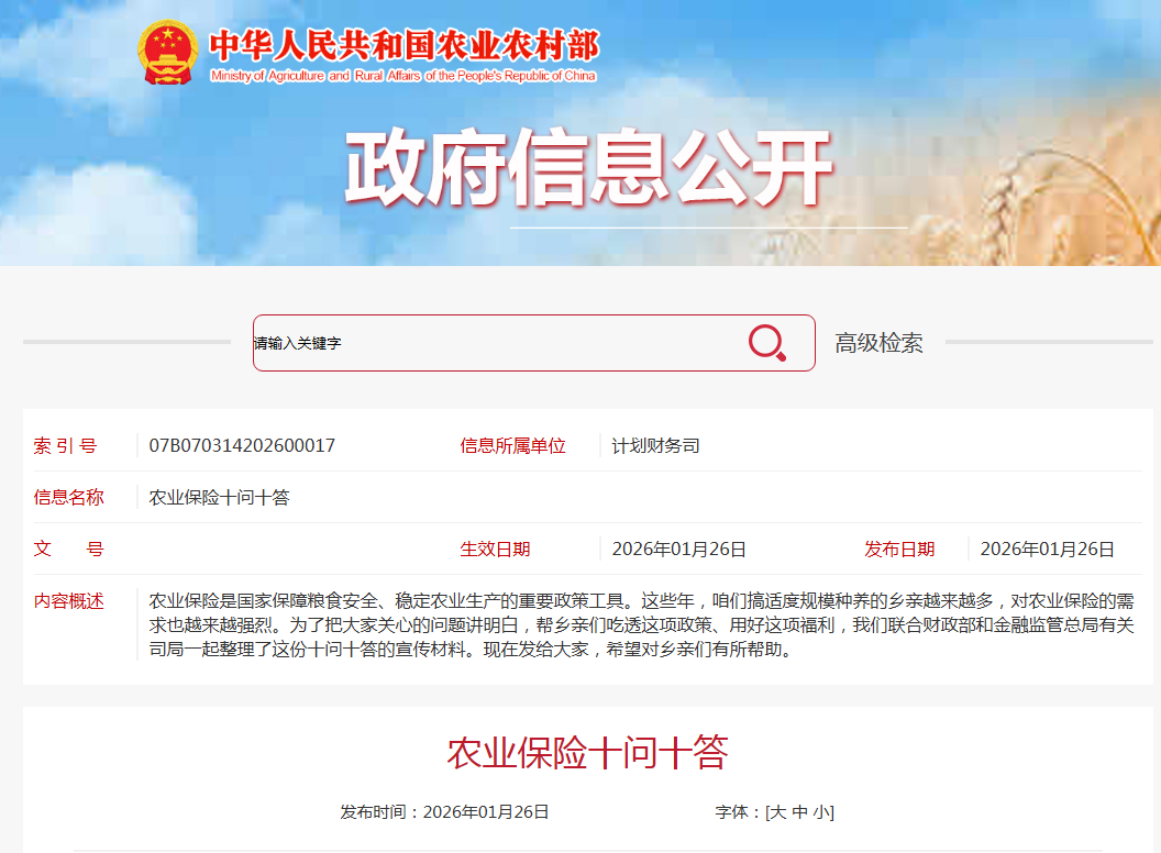 农业保险是国家保障粮食安全、稳定农业生产的重要政策工具。这些年,咱们搞适度规模种养的乡亲越来越多,对农业保险的需求也越来越强烈。为了把大家关心的问题讲明白,帮乡亲们吃透这项政策、用好这项福利,农业农村部联合财政部和金融监管总局有关司局一起整理了这份十问十答的宣传材料。现在发给大家,希望对乡亲们有所帮助。