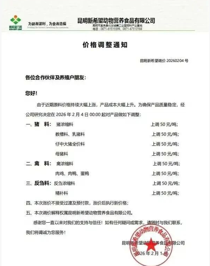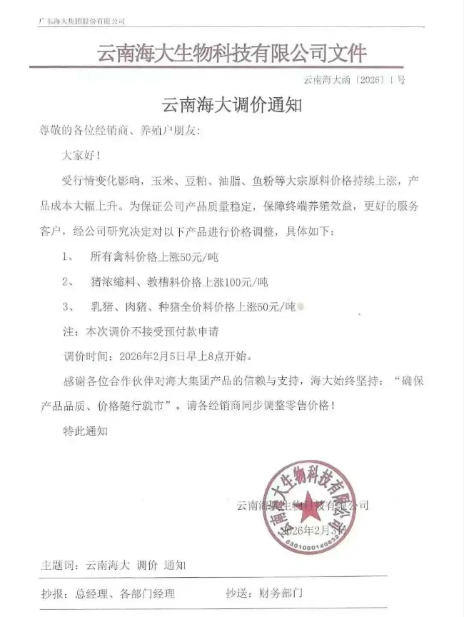 2026年1月,生猪养殖行业持续承压,猪价连续27周低位运行,行业普遍亏损。与此同时,海大、新希望等头部饲料企业集体提价,养殖户陷入“价跌本涨”的双重困境。