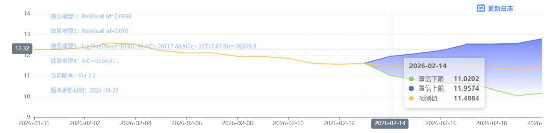 玄田算法是由项目课题组团队原创的非经典逻辑数值聚合理论和不确定性预测方法,构建了基于一致模算子的生猪价格预测模型。该模型采用的聚合函数及一致模相关理论与方法已获得多项国家自然科学基金和省级自然科学资金资助,并获得多项省级自然科学奖奖项。02月14日预测猪价为11.4884,置信区间在11.0202--11.9574之间。02月15日预测猪价为11.4456;02月16日预测猪价为11.4375。